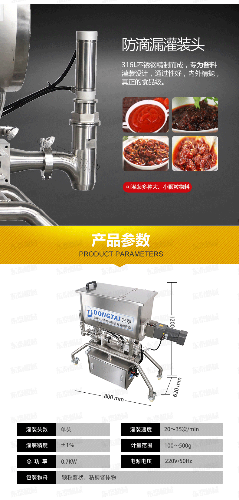 辣椒醬灌裝機 適合于將各類粘稠體及含有各種固體物質(zhì)如辣椒、花生、肉塊、佐料等物體的醬類和油、料分離的火鍋底料等灌裝于各種容器中,辣椒醬灌裝機 適用于辣椒醬、顆粒醬料、大塊肉醬、火鍋底料等的灌裝。辣椒醬灌裝機 /半自動辣椒醬灌裝機可灌裝顆粒漿狀流體物料,特別適用于調(diào)味品中帶顆粒并且濃度較大的辣椒醬、火鍋底料等粘稠醬類的灌裝,配置的自動攪拌器,辣椒醬灌裝機 保證了醬和油的充分混合,又稱為辣椒醬灌裝機、花生醬灌裝機、豆瓣醬灌裝機、果醬灌裝機,芝麻醬灌裝機、粘稠醬類灌裝機、牛肉醬灌裝機。