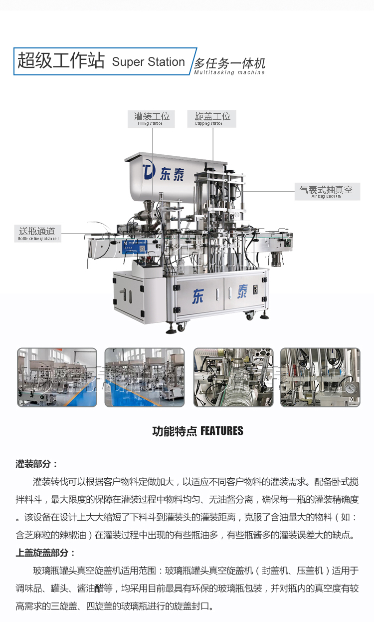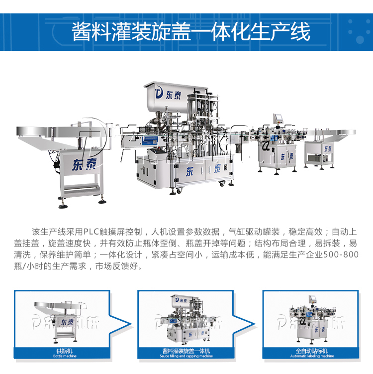 如果是瓶裝的話,可以建議使用我們的辣椒醬灌裝旋蓋一體機。在一臺機械上實現上蓋灌裝抽真空旋蓋等動作。該設備可以通過大顆粒醬料,攪拌均勻,具有灌裝精密,運行穩(wěn)定可靠、工作效率高、壽命長、維護間單等特點。廣泛適用于各種含顆粒的半流體、膏體、醬料的灌裝,也可灌裝各種粘稠體等,價格方面也非常合適。