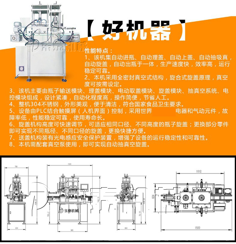 該機(jī)借鑒國外技術(shù),結(jié)合國內(nèi)客戶需求研發(fā)而成。該機(jī)集自動(dòng)進(jìn)瓶、自動(dòng)理蓋上蓋、自動(dòng)抽真空旋蓋、自動(dòng)出瓶于一體,生產(chǎn)效率高,運(yùn)行穩(wěn)定可靠,是食品醬料、飲料、保健品等行業(yè)馬口鐵三(四)旋蓋理想的抽真空旋蓋設(shè)備。