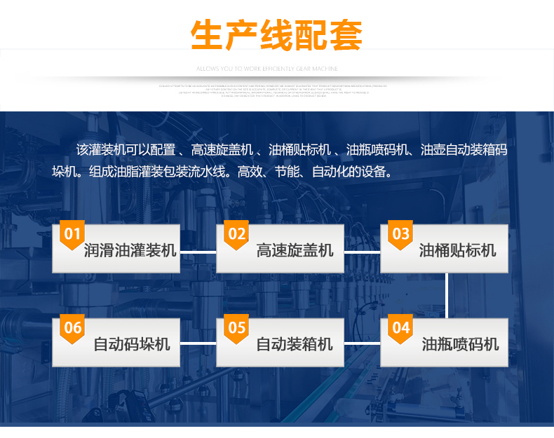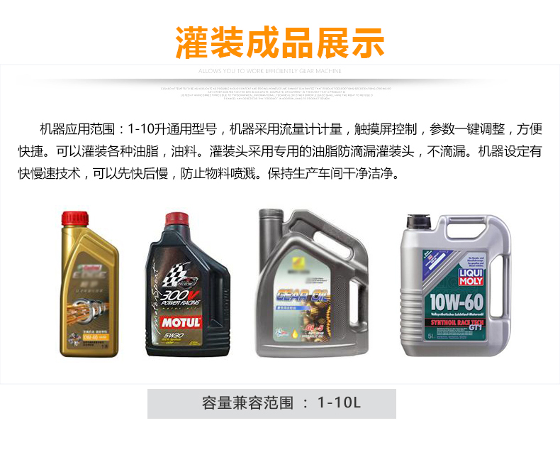 該大型潤滑油灌裝機采用容積式計量灌裝原理,適用于各種規(guī)格(1-5L)的液體肥等液體灌裝。設備采用伺服驅動活塞計量,保證了 1‰的灌裝,在保證灌裝的同時,提高了 20%-35%的灌裝速度,操作簡單,維護方便,節(jié)省人工成本,生產效率更高。