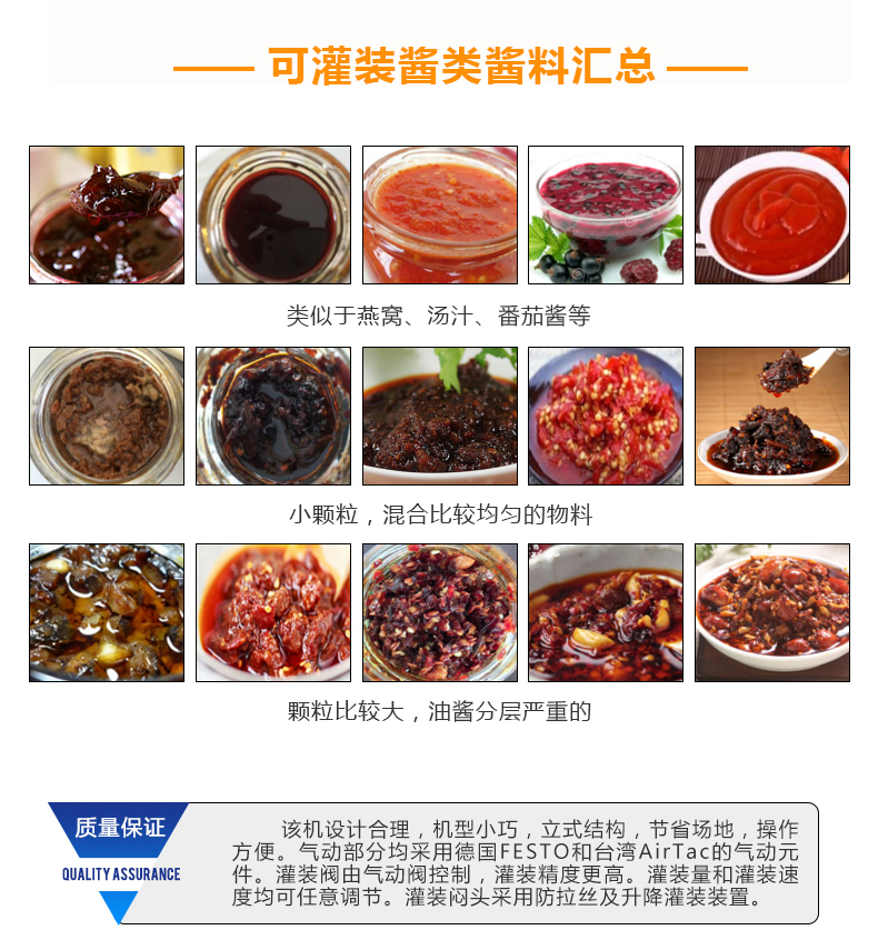 身為公司新生產制造的灌裝機在行業(yè)市場上發(fā)揮了重要的作用,是集光,機,電,氣于一體,選用活塞式定量原理,灌裝精確度高,使用比較簡單,維護非常方便,設備主要材質:辣椒醬灌裝機選用SUS304不銹鋼制造,衛(wèi)生指標要求.灌裝環(huán)節(jié)選用亞克力透明板與外部隔離,確保灌裝的衛(wèi)生要求。灌裝選用壓力式灌裝,無須配裝高位罐,簡易化了組裝工序,提高了灌裝工作效率??善毡槭褂糜谑称贰⑨u料制造業(yè)設備的自動化包裝生產制造